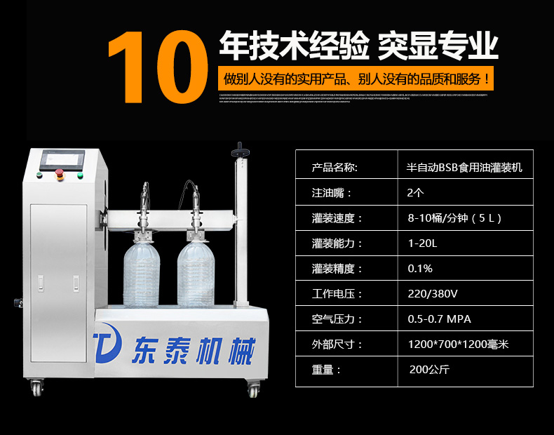 本機(jī)適用于花生油、大豆油、菜籽油、色拉油、芝麻油、石油化工潤滑油等各種油類和粘稠液體的定量要求。半自動(dòng)雙頭電動(dòng)BSB食用油灌裝機(jī):采用的微電腦技術(shù),自備動(dòng)力,管路無需加壓,節(jié)約運(yùn)行成本;自動(dòng)檢測油浙、自動(dòng)修正溫度變化引起的密度變化,適合大溫差環(huán)境的油品灌裝工作,使用方便靈活;機(jī)電一體化設(shè)計(jì),安裝方便,整機(jī)價(jià)格低廉。
